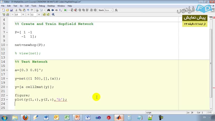در این پست قصد داریم فیلم آموزشی شبکه های عصبی هاپفیلد یا Hopfield Neural Network در متلب را معرفی کنیم که در آن علاوه بر مرور مبانی تئوری شبکه های عصبی هاپفیلد (Hopfield) و ارتباط آن با نظریه سیستم های دینامیکی غیر خطی، پیاده سازی عملی این نوع از شبکه عصبی برای حل مسأله بازشناسی الگو و تشخیص کاراکتر (Character Recognition) مورد بحث و بررسی قرار گرفته است. در ادامه، کاربرد این نوع از شبکه های عصبی در حل مسائل بهینه سازی ترکیباتی (Combinatorial) مانند مسأله فروشنده دوره گرد یا TSP مورد بررسی واقع شده است. ضمنا، ماشین بولتزمان به عنوان یک نسخه تصادفی از شبکه عصبی هاپفیلد نیز در این فیلم آموزشی معرفی شده است.