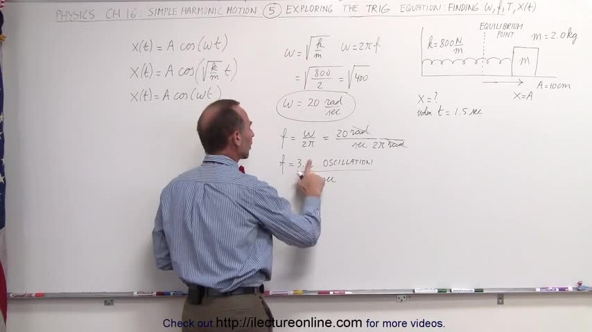 Visit http://ilectureonline.com for more math and science lectures! In this video I will use the simple harmonic motion trig equation to find omega=?, f=?, T...